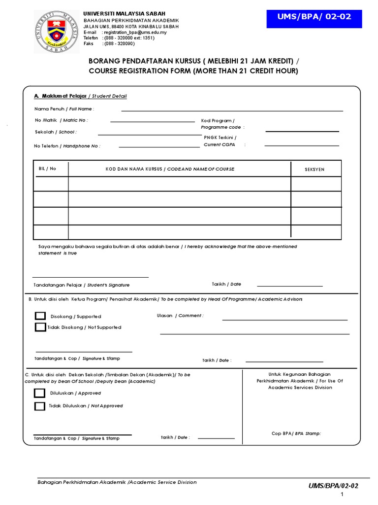 Borang Pendaftaran Kursus Melebih 21 Jam Kredit Pdf